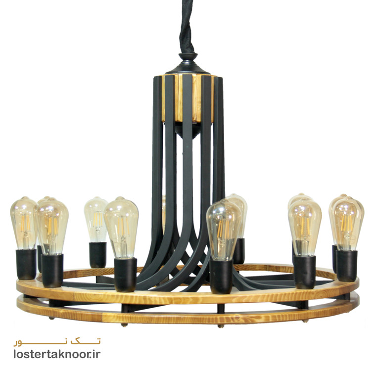 لوستر ماکان ۱۲ شعله فلزی، ترکیبی هنرمندانه از چوب و فلز است که جلوهای صنعتی و مدرن به محیط میدهد.